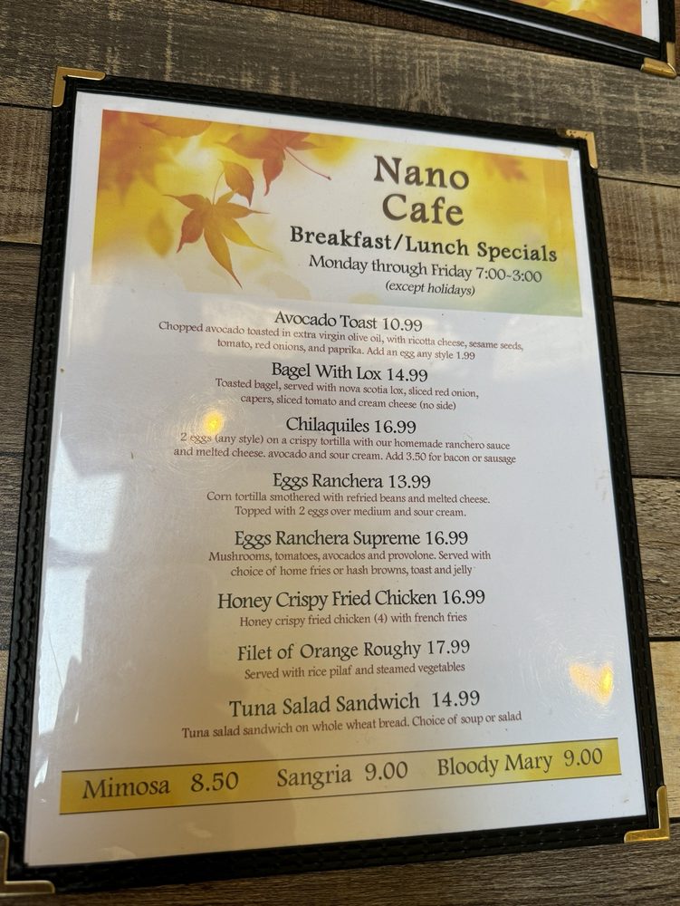 Welcome to Nano Cafe, your go-to American breakfast and brunch spot nestled in Sierra Madre, California. Located at 322 W Sierra Madre Blvd, this cozy locale combines the heartiness of classic breakfast fare with a welcoming atmosphere.